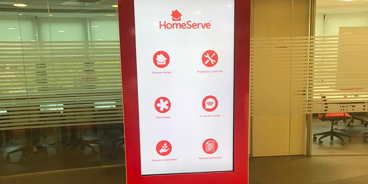 Home Serve adquiere un tótem táctil de 43″ totalmente personalizado con sus colores corporativos para sus instalaciones de Madrid a nuestra empresa Visualpanel.